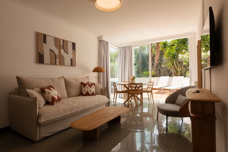 Sie befinden sich im ersten Stock und sind ausgestattet mit einem Kingsize-Bett, einem geräumigen Wohnzimmer mit Küche und einem Badezimmer.